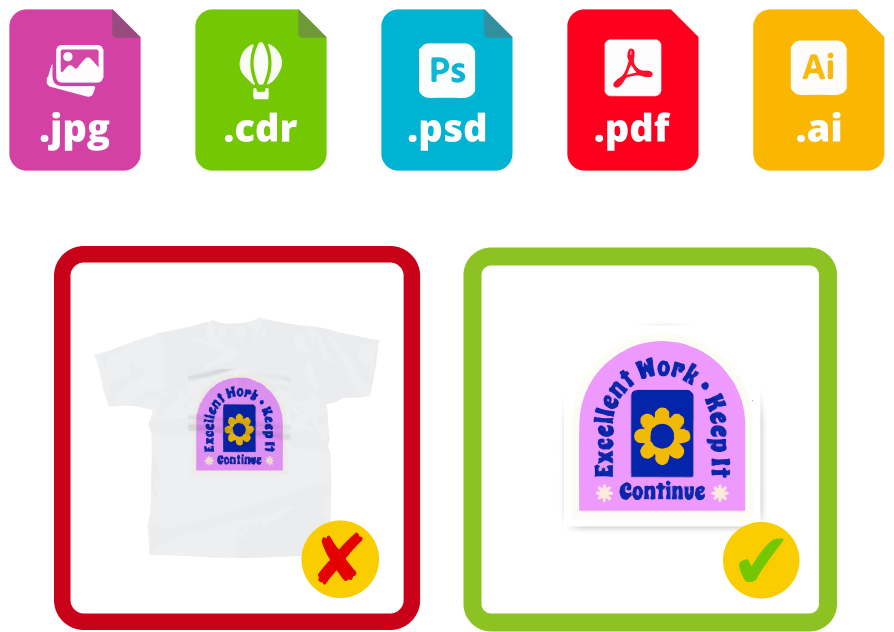 - Format file bisa berupa .jpg .png .pdf .ai .cdr .eps .psd. Warna pada hasil cetak merupakan CMYK yang berbeda dengan layar monitor RGB, jadi hasil cetak tidak akan bisa 100% menyerupai warna monitor.